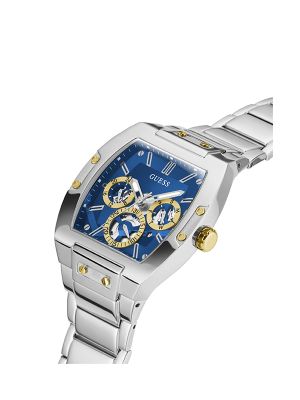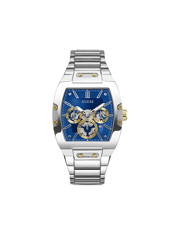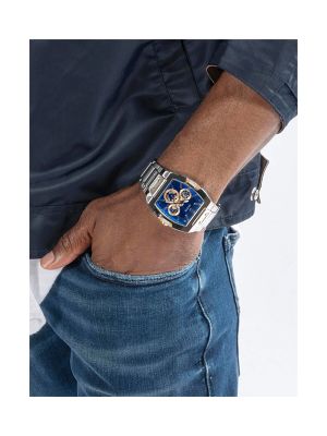 43mm, tonneau face, geometric dial, baton hands, chronograph counters, date indication, manual-winding movement, screw-down crown, adjustable link bracelet, folding clasp.