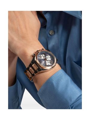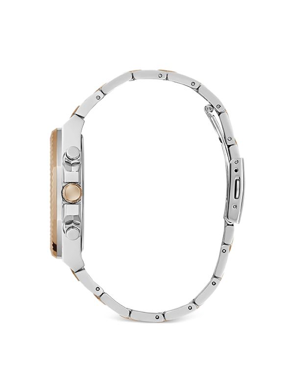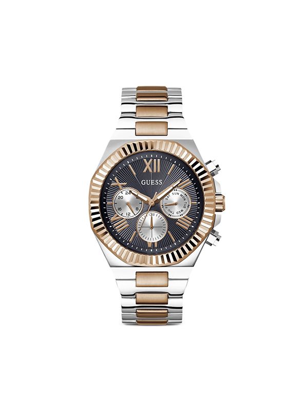 44mm, rose gold-tone, octagonal face, Roman numeral dial, baton hands, chronograph counters, date indication, battery-operated movement, two chronograph pushers, screw-down crown, adjustable link bracelet, folding clasp.