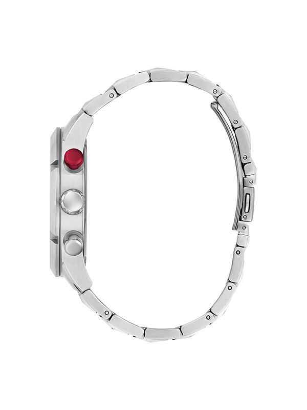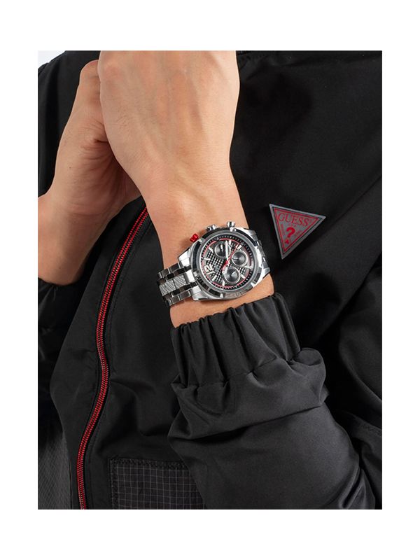 44mm, round face, guilloché dial, geometric dial, baton hands, chronograph counters, date indication, battery-operated movement, two chronograph pushers.