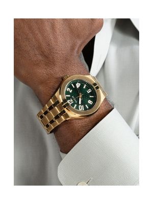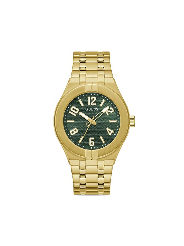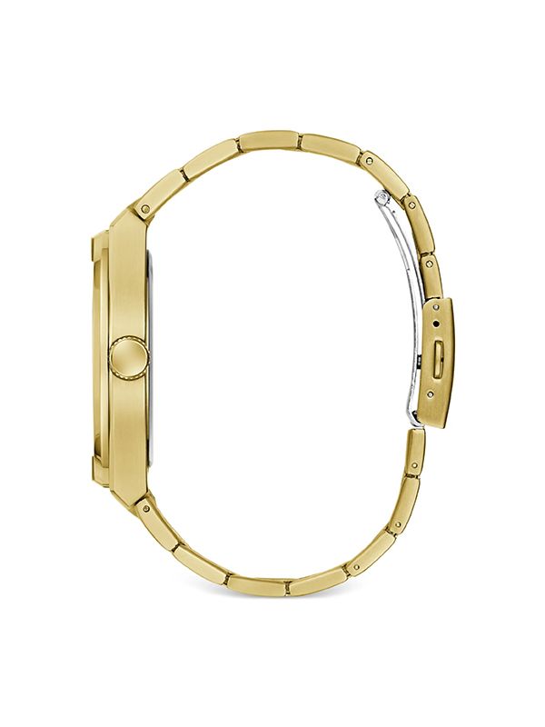 44mm, gold-tone, round face, guilloché dial, Arabic dial, baton hands, manual-winding movement, screw-down crown, adjustable link bracelet, folding clasp.