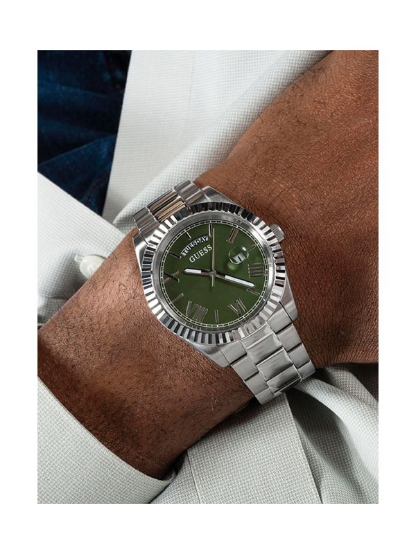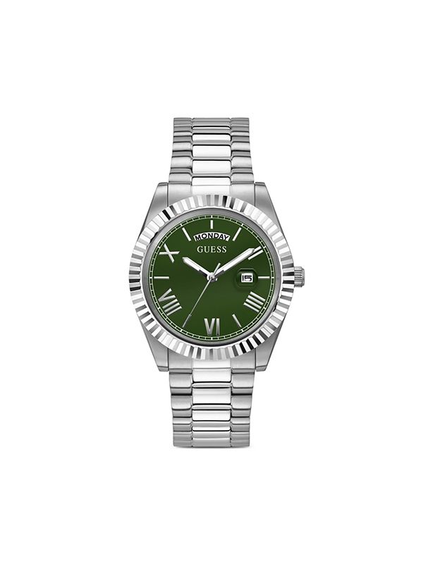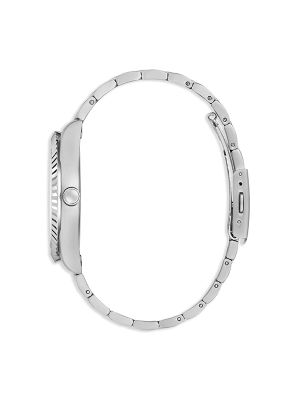 42mm, round face, Roman numeral dial, baton hands, date indication, quartz movement, fluted bezel, screw-down crown, adjustable link bracelet, folding clasp.