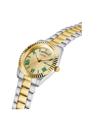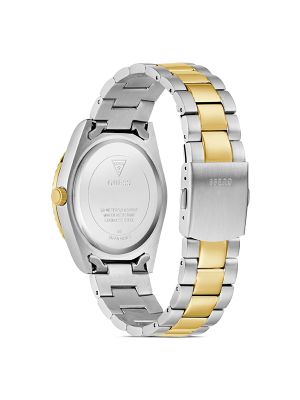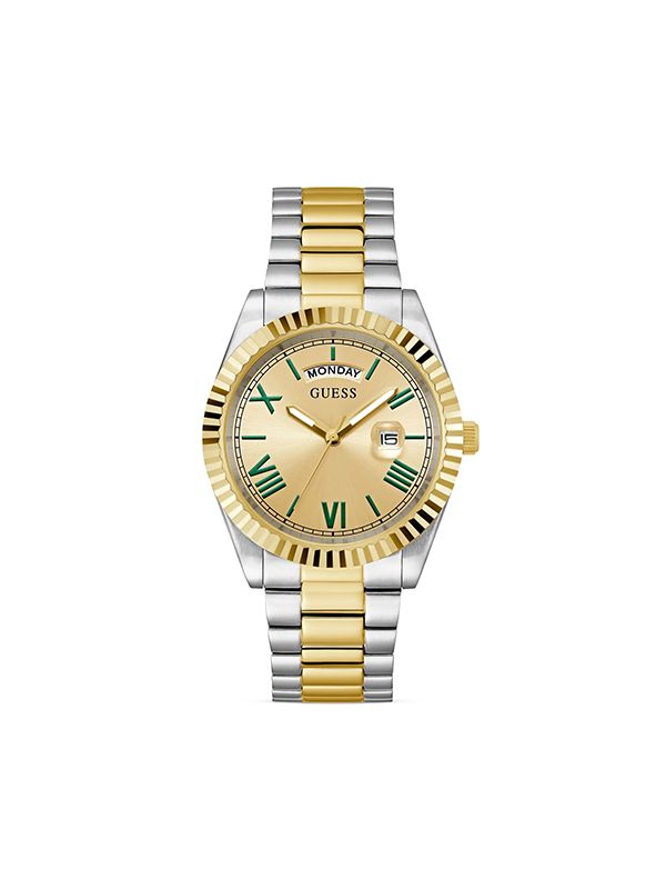 36mm, quartz movement, round face, Roman numeral dial, day-date display, stainless steel link bracelet, folding clasp, water resistance up to 30m/3 ATM.