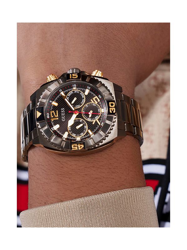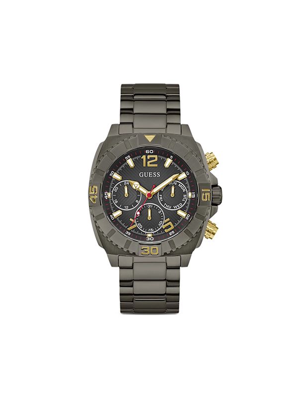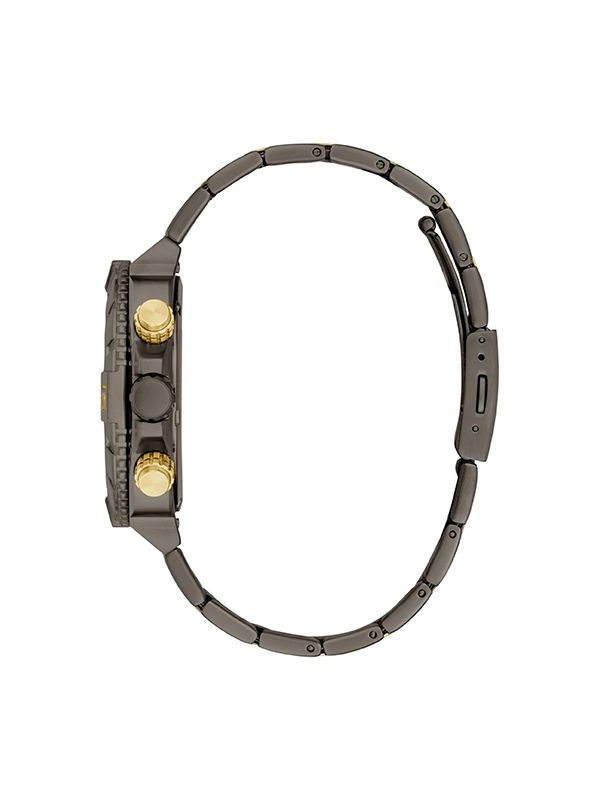 44mm, Arabic dial, arrow hands, chronograph counters, round face two chronograph pushers, adjustable link bracelet, folding clasp.