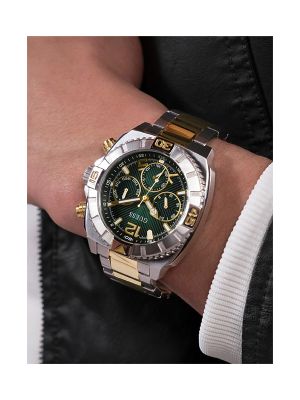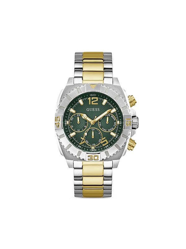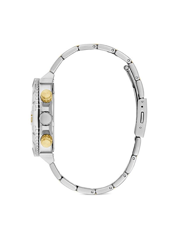 44mm, Arabic dial, arrow hands, chronograph counters, round face, adjustable link bracelet.