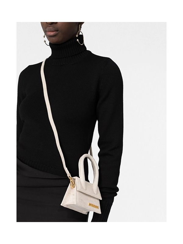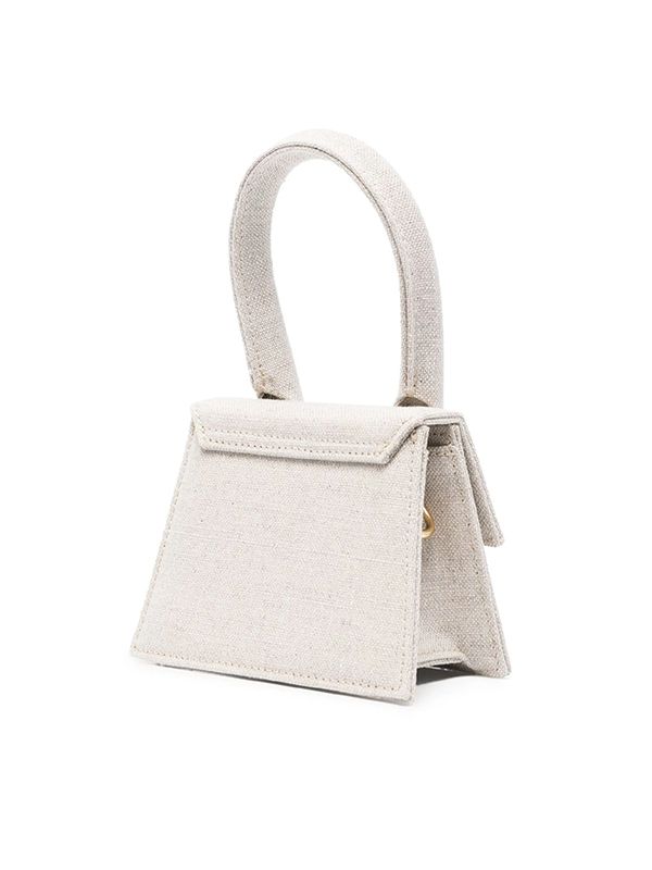 Fold over top with magnetic fastening and main compartment, linen, single rolled top handle, adjustable detachable shoulder strap, gold-tone logo lettering.