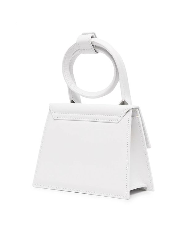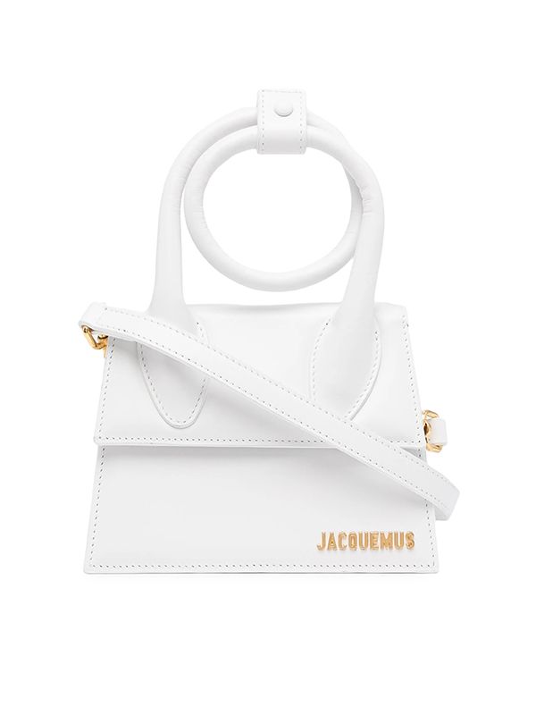 Fold over top with magnetic fastening, gold-tone logo lettering, detachable shoulder strap, single circular top handle, internal card slot.