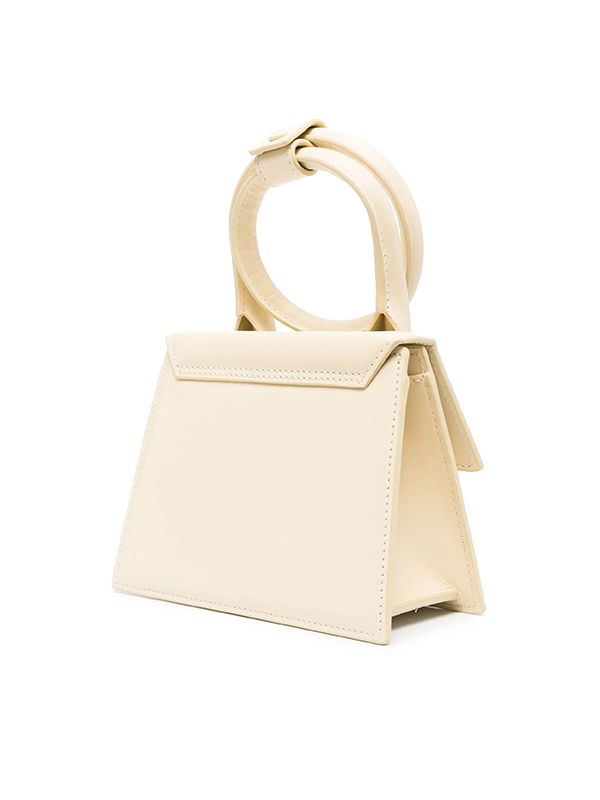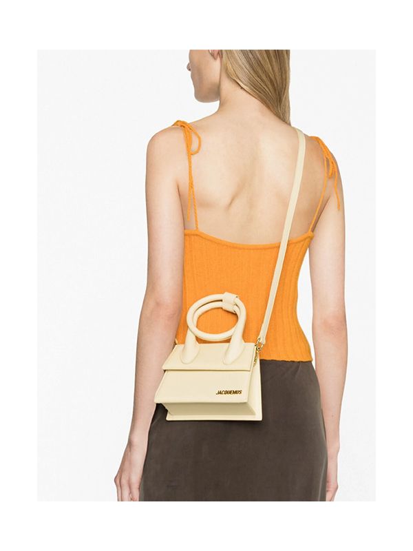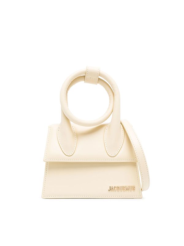 Fold over top with magnetic fastening, gold-tone logo lettering, single circular top handle, adjustable detachable shoulder strap, main compartment, cotton lining, internal logo patch, internal slip pocket.
