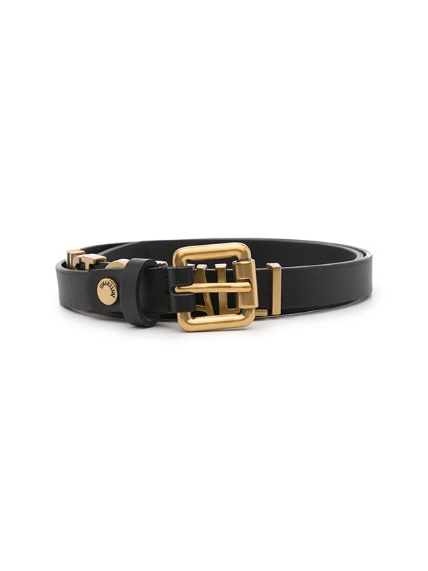 Logo lettering, pre-drilled holes, adjustable fit, gold-tone hardware, buckle fastening.