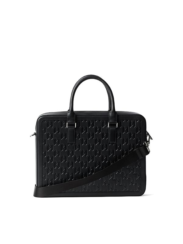 Debossed monogram pattern, silver-tone hardware, silver-tone logo lettering,