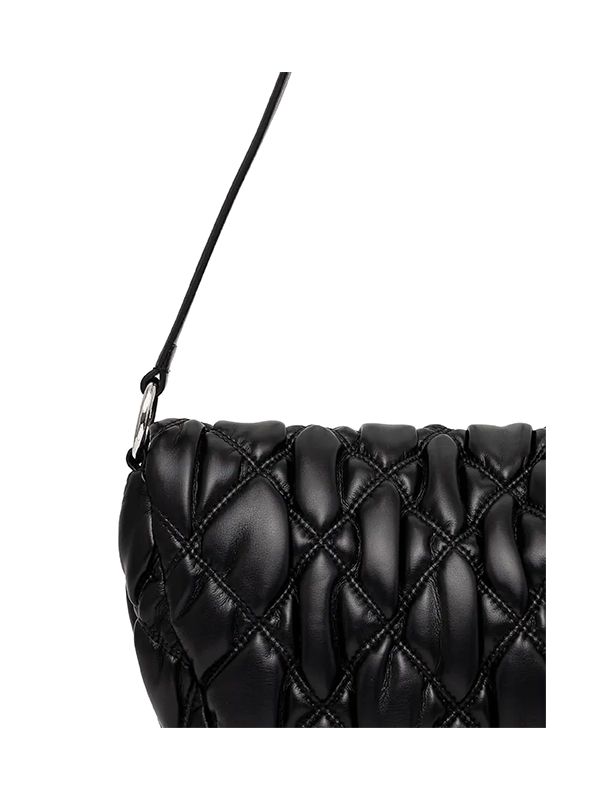 Fold over top with magnetic fastening, faux leather, diamond quilting, adjustable shoulder strap, silver-tone logo lettering, main compartment, partial lining, internal zip-fastening pocket, internal logo patch.