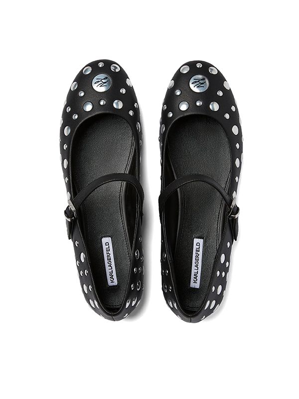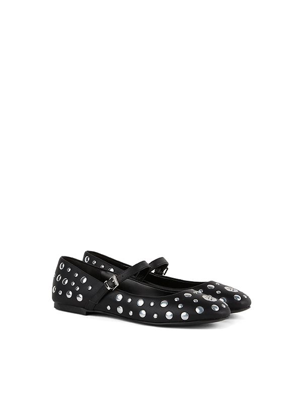 Calf leather, side buckle fastening, stud embellishment, almond toe, branded insole, flat rubber sole.