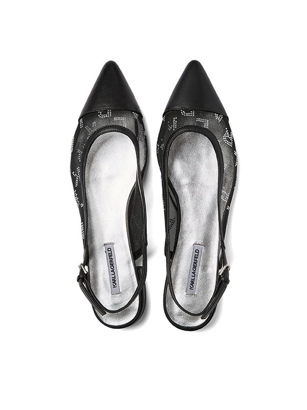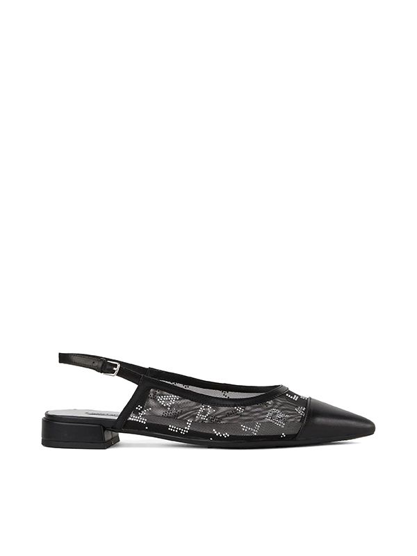 Mesh design, buckle-fastening ankle strap, leather trim, crystal logo embellishment, tonal toecap, pointed toe, branded leather insole, leather sole.
