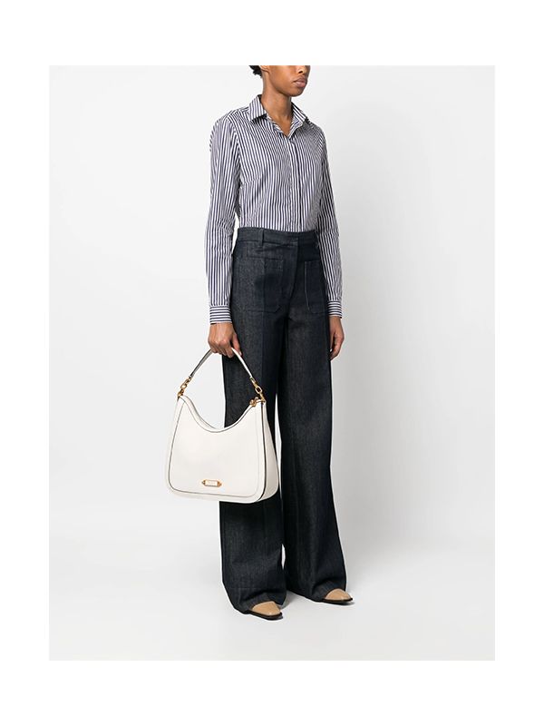 Two-way zip fastening, pebbled texture, logo plaque, gold-tone hardware, single top handle, internal zip-fastening pocket.