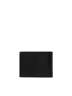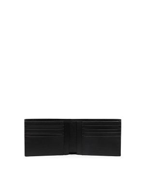 Gold-tone logo lettering, bi-fold design, internal logo stamp, internal card slots, note compartment.