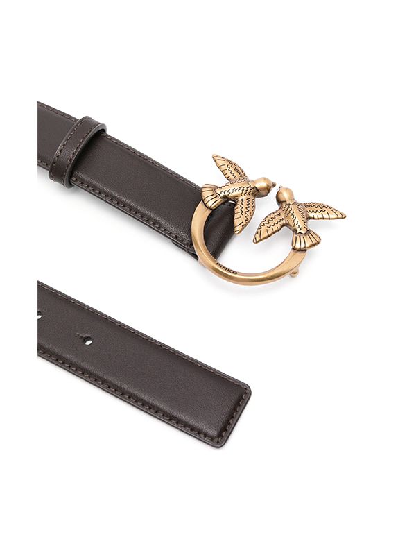 Pin fastening, punched holes, flat tip, signature Love Birds buckle.