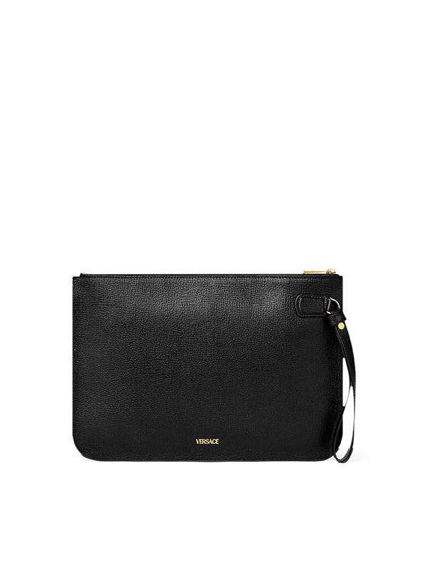 Brand: Versace Colour: Black Gender: Men Material: Leather goatskin textured finish Medusa plaque detail logo lettering top zip fastening loop Handle foldover pocket main compartment internal card slots gold-tone hardware Size: Depth 7cm, Width 28.5cm, Height 20cm.